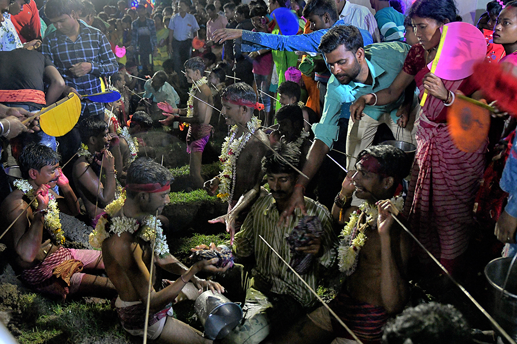 All Sannasir are in bare bodies, wearing only small langot, as Indian village wrestlers wear during wrestling. After reaching their original destination, the devotees slowly start removing the iron rods from their mouth and body. This time faint traces of blood are noticed in their mouth and body. Surprisingly, they don’t use any antiseptic or any medicine on their injuries. Immediately after removal of the iron rods, they are provided with some leaves which they put into their mouth. The leaves are locally known as ‘Kala Puspa’. It is used to stop bleeding and reducing pain and it works like magic. It is known that injuries are cured within two three days. The morning ritual is finished after they removed the iron rods.