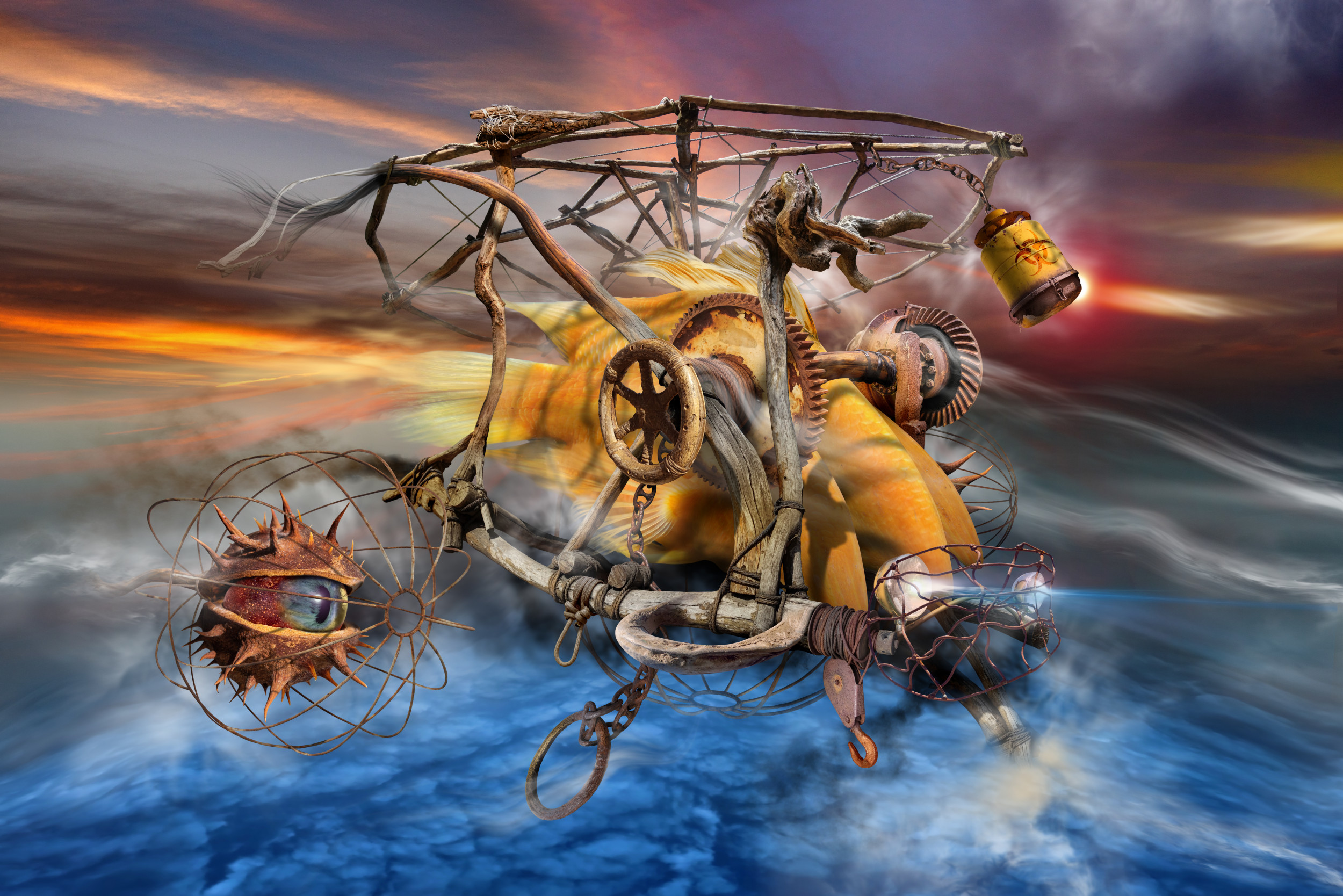 Sometimes I wish the workflow was shorter, but usually that doesn't happen. I have managed to finish 2 works within a month, but others take a year. It depends on inspiration, desire and incentive to work. When I have enough cut out photo details ready I start combining them together to create the main object. Then if I'm happy with the result I start making the auxiliary objects or creatures. This shapes the composition and the interaction between them. Finally comes the turn of the background or environment, light, shadow, etc. I use parts of many photos to get a strange and fantastic world.